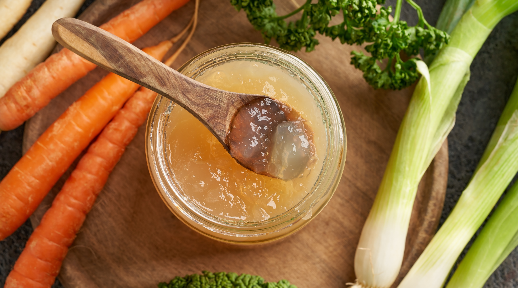Benbuljong är rik på glycin, glutamin och prolin – aminosyror som ger energi till tunntarmens celler och hjälper till att täta slemhinnan.