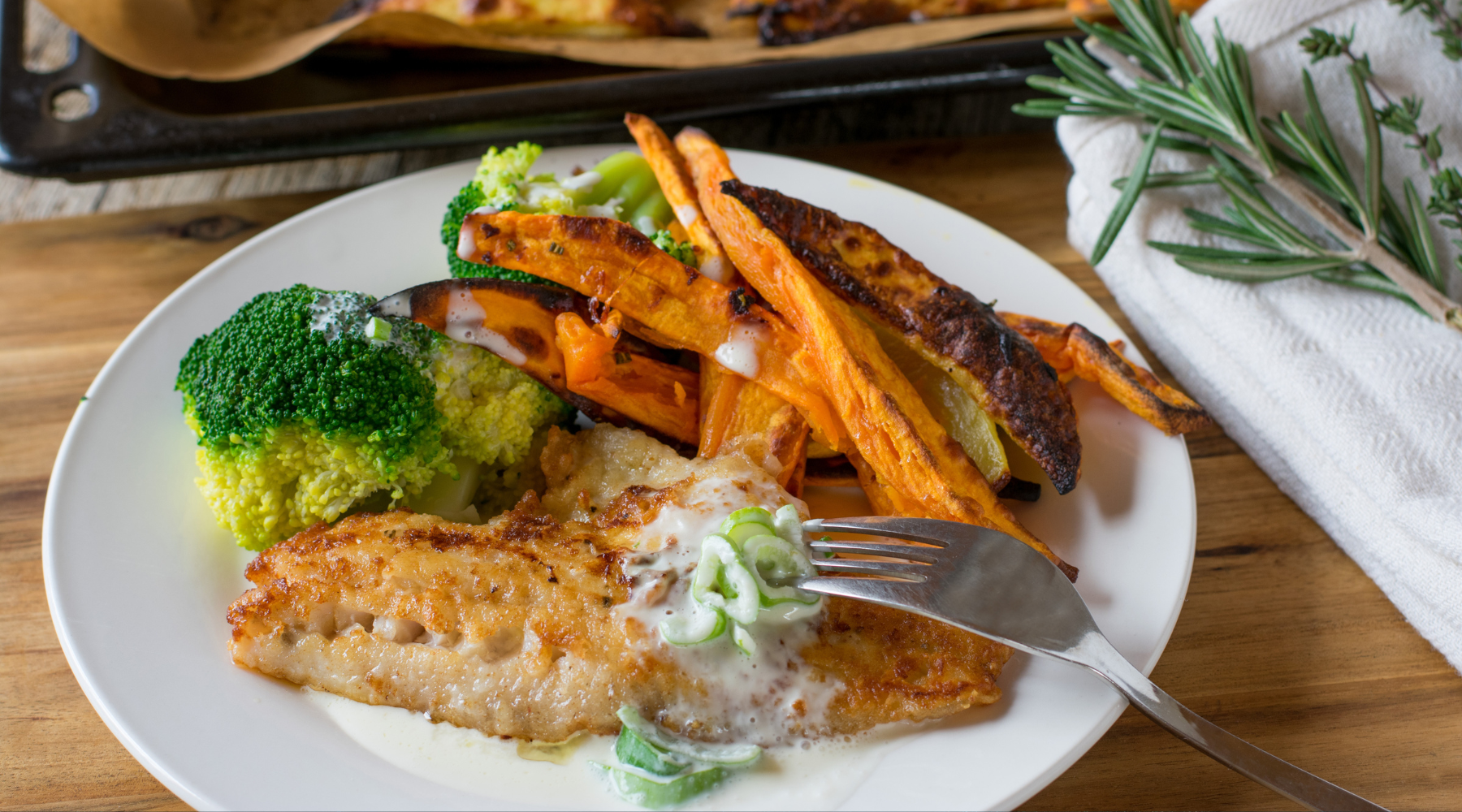 Ugnsbakad lax med sötpotatis och ångad broccoli, toppad med olivolja.